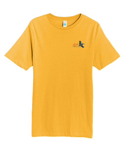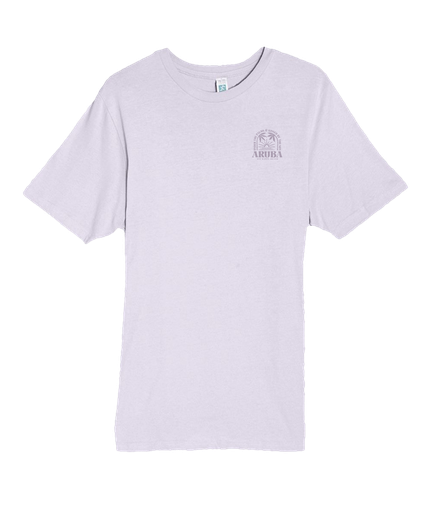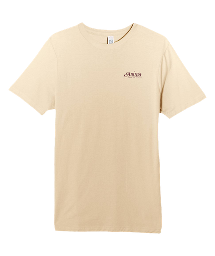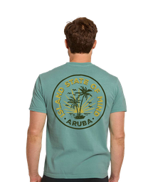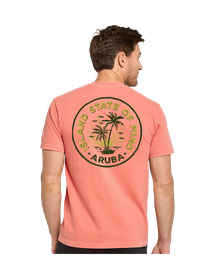 Screen-printed souvenir tee featuring "Island State of Mind Aruba" circular badge design with palm trees.